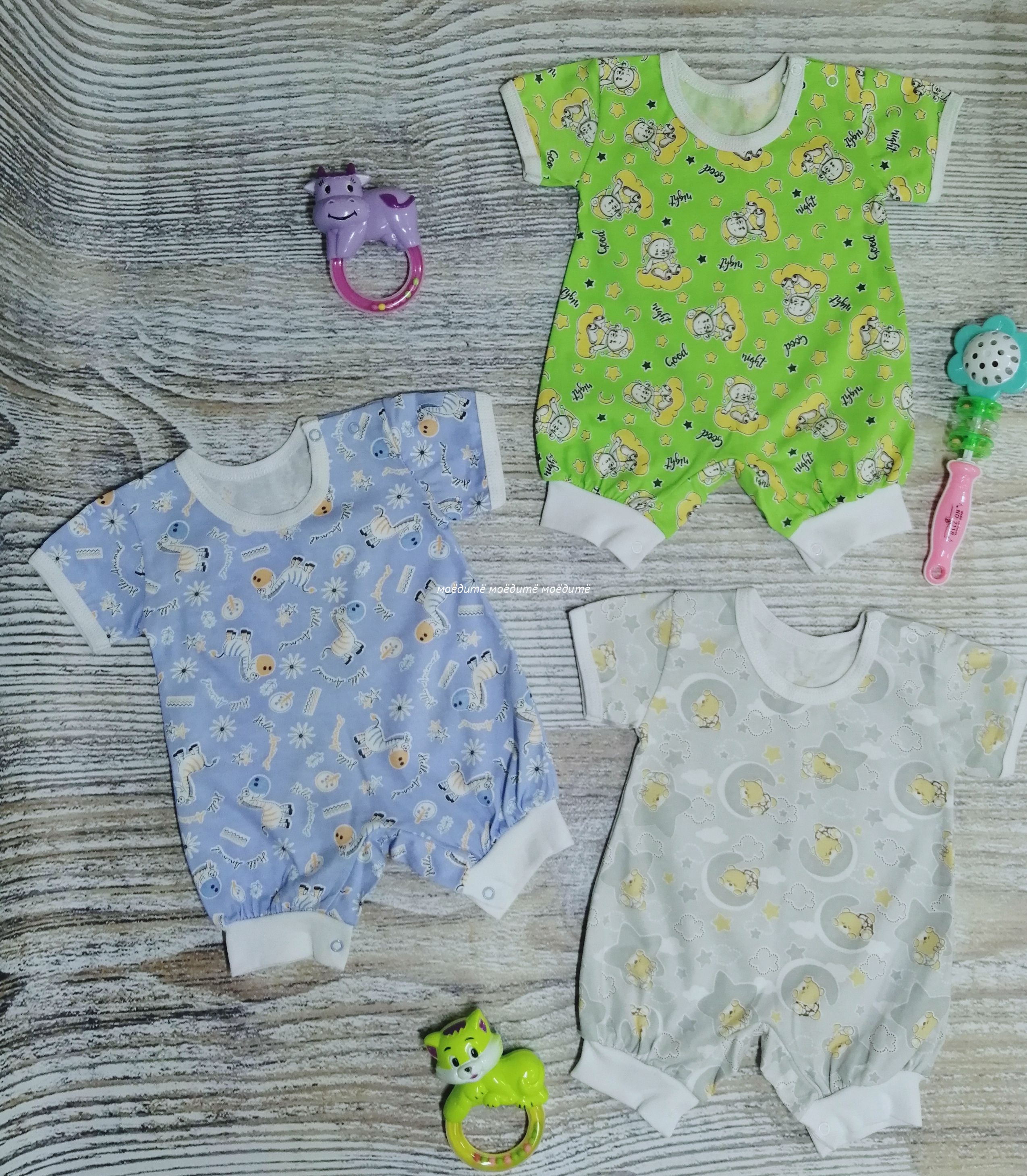 Песочник с коротким рукавом, с кнопочками на одном плече и между ножек.