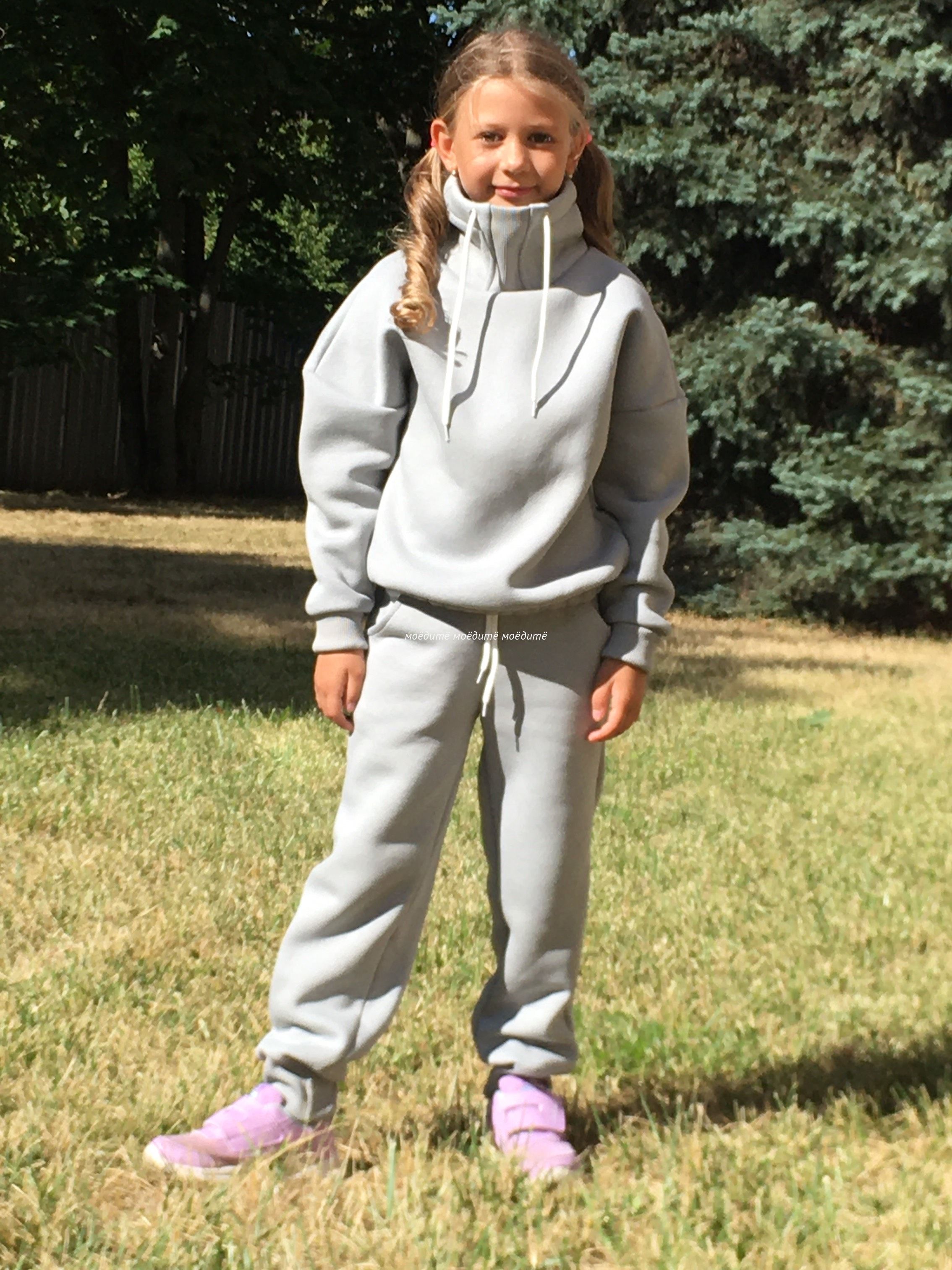 Костюм выполнен из футера 3-хнитки с начёсом. Состоит из свитшота и брюк. Брюки сверху на широкой резинке и со шнурком, снизу на манжете с отворотом. Свитшот с воротником-стойкой, украшен шнурком, снизу вставлена резинка, рукава на манжетах с отворотом.