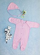 Комплект состоит из комбинезона без воротничка, с закрытыми ножками, рукавчики с царапками, спереди и между ножек на кнопочках и чепчика на завязках. Все швы у комплекта выполнены наружу.